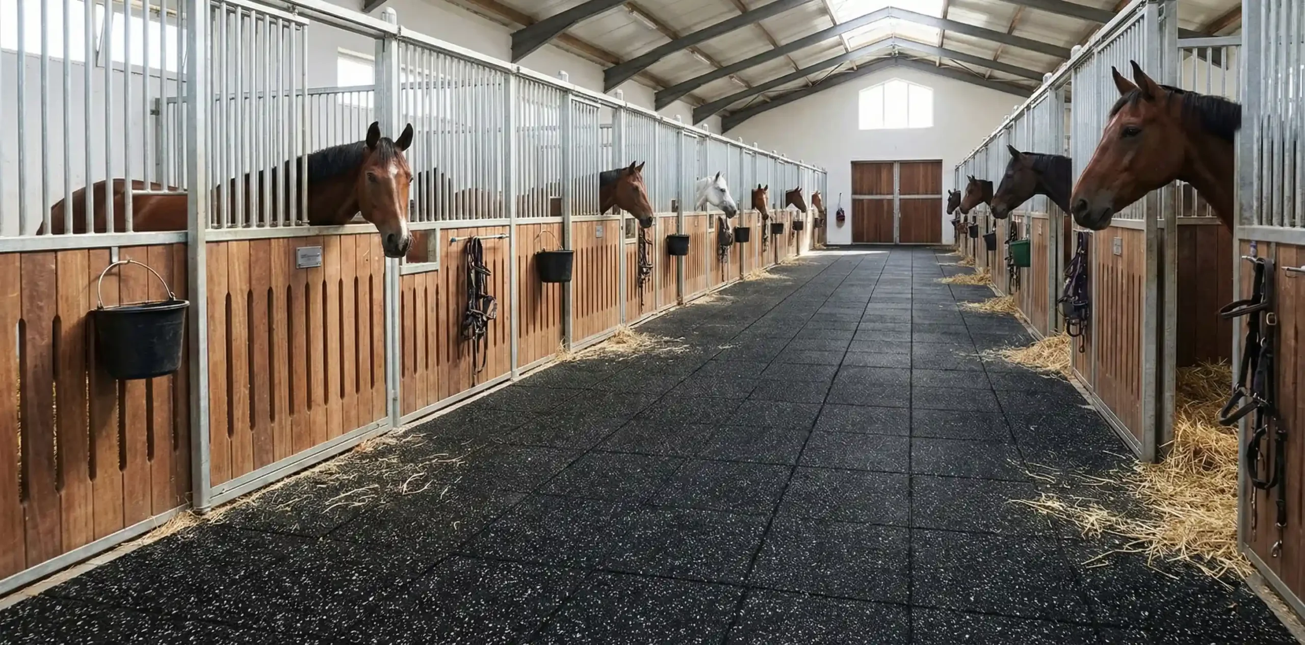 Heavy-duty rubber tiles designed for horse stables and equestrian facilities. They provide comfort for animals, slip resistance, and excellent drainage while reducing joint stress.
